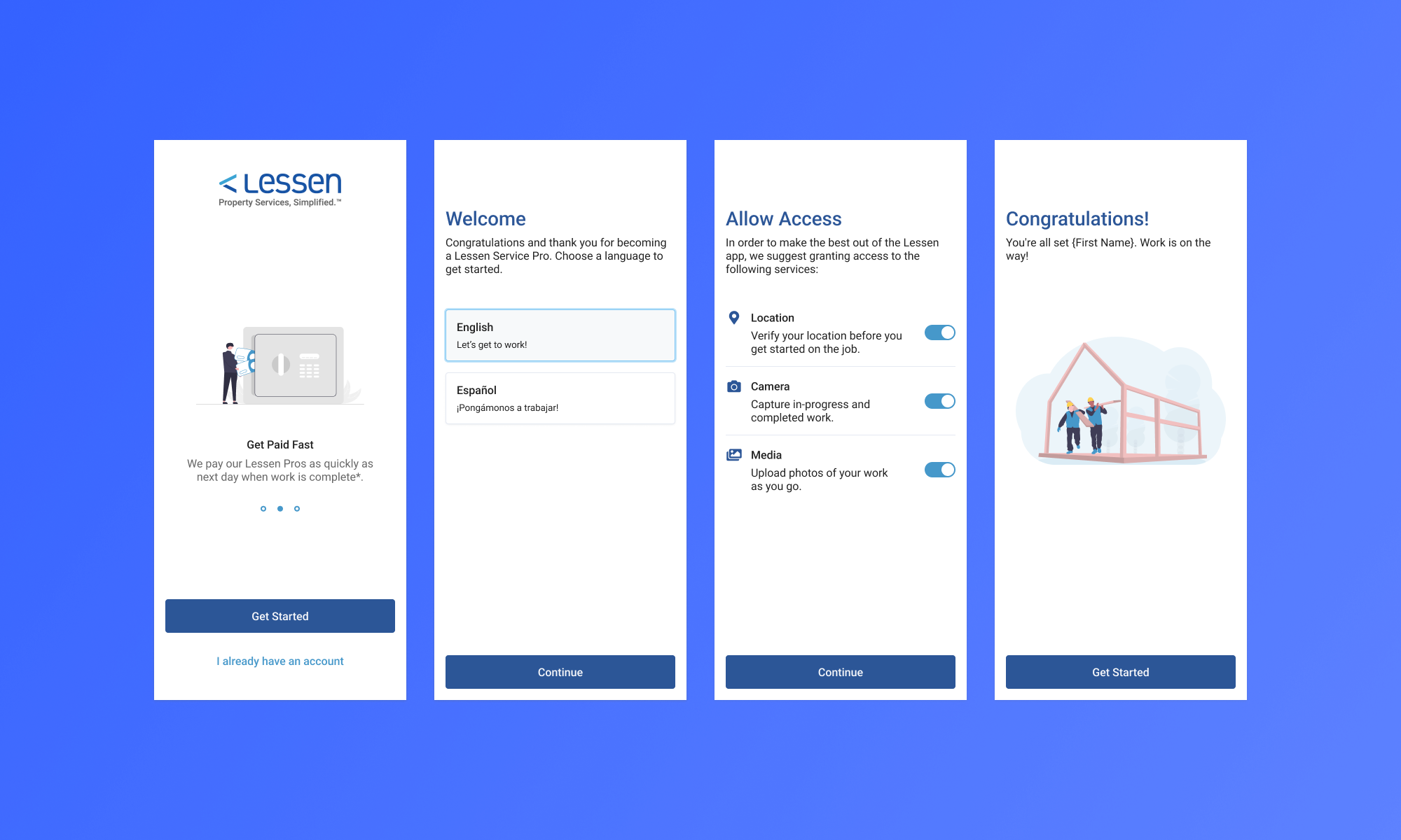Lessen Pro is an Android and iOS application created for Lessen Inc, a property services company that is trying to re-imagine how rental properties are serviced at scale. The application not only allows service professionals to accept, report on, and ultimately complete work, they also get paid quickly utilizing an in-app invoicing system. The application uses React Native as its development framework for good scalability and OS based functions, and was designed for both phone & tablet experiences.