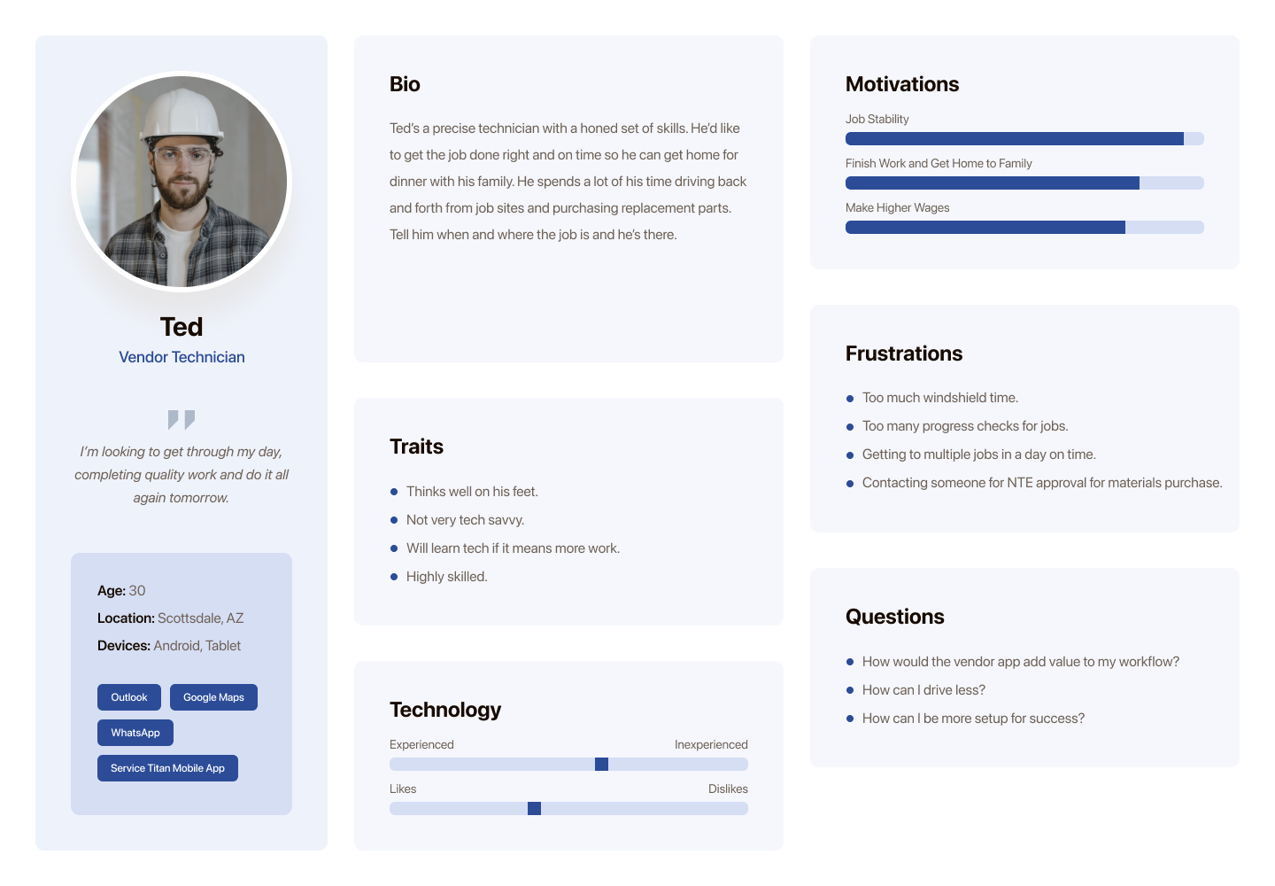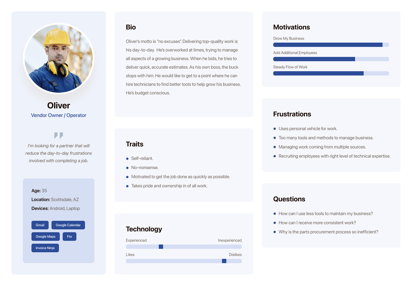 Along with user interviews we also conducted vendor (service pro) shadows to get a better glimpse into their every day. Our team shadowed 6 different vendor owner / operators to examine their day and how they go about dealing with their work and interacting with Lessen. These shadows then helped lead and inform our Service Pro Personas.