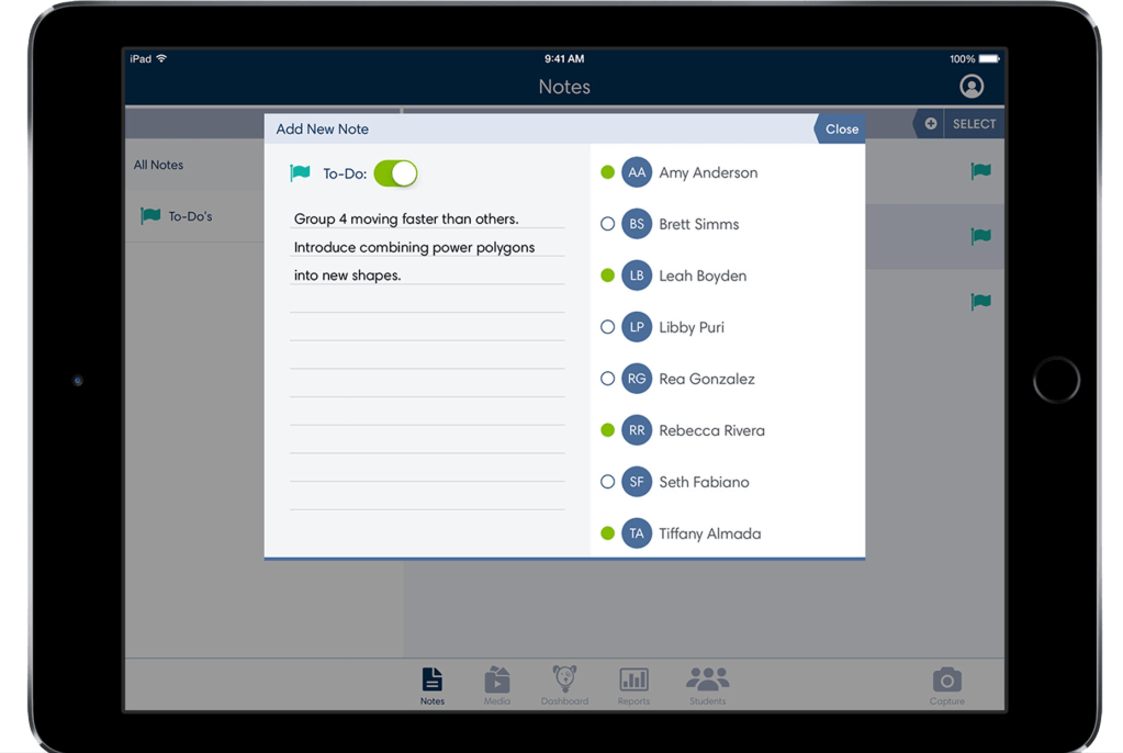 - Taking individual and group notes on students and be able to quickly access and edit those notes.