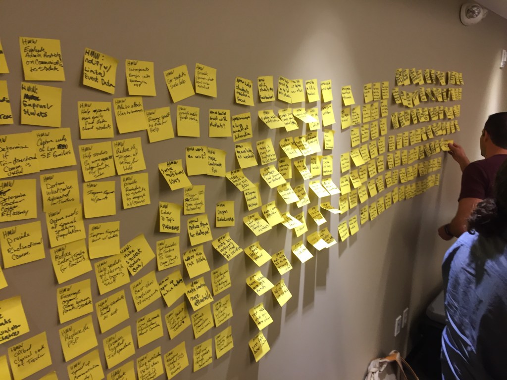Day 1: “How Might We’s” written by the whole group and then affinity mapped to certain categories.